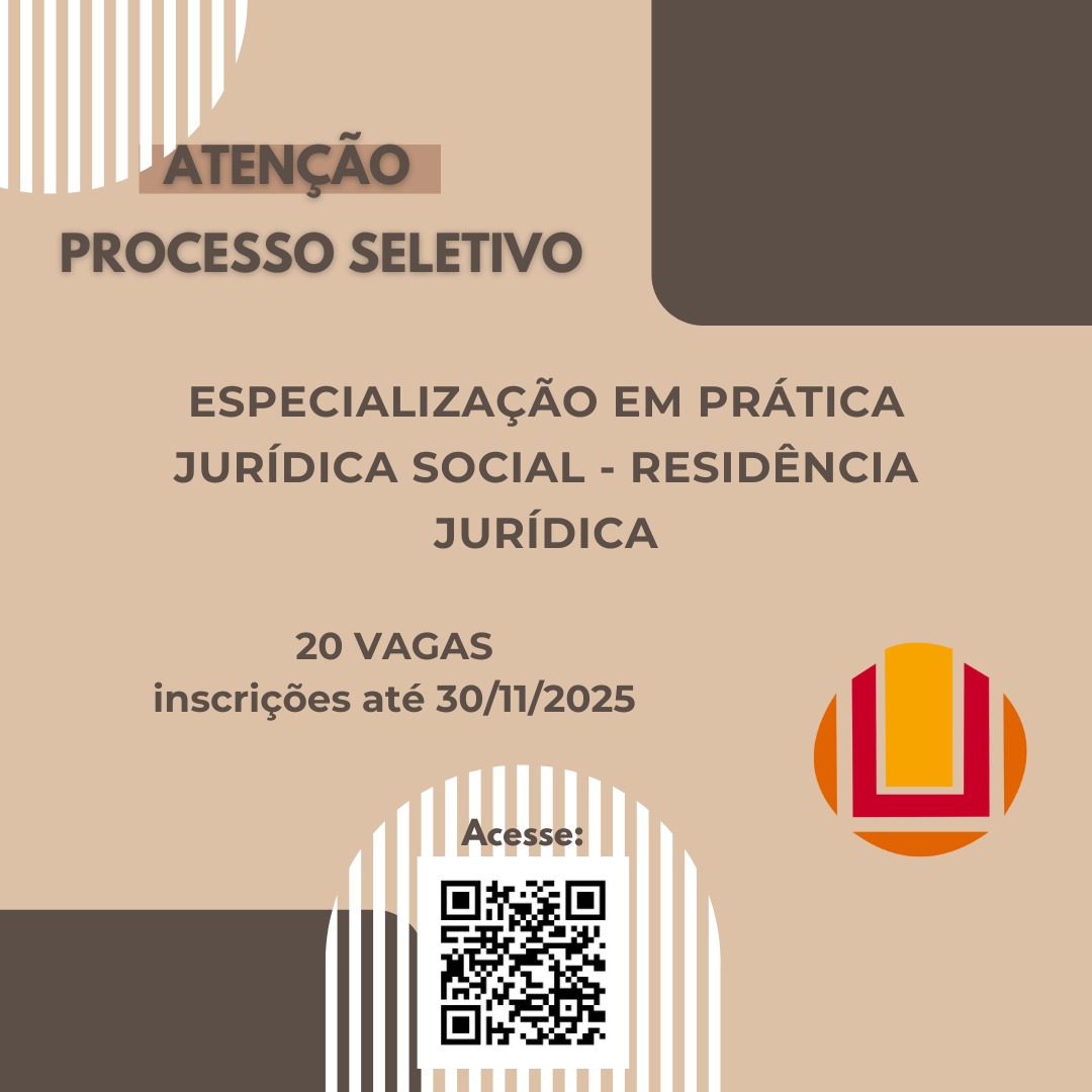 A Faculdade de Direito informa que estão abertas as inscrições para o Processo Seletivo do curso de Especialização em Prática Jurídica Social – Residência Jurídica da Universidade Federal do Rio Grande (FURG).